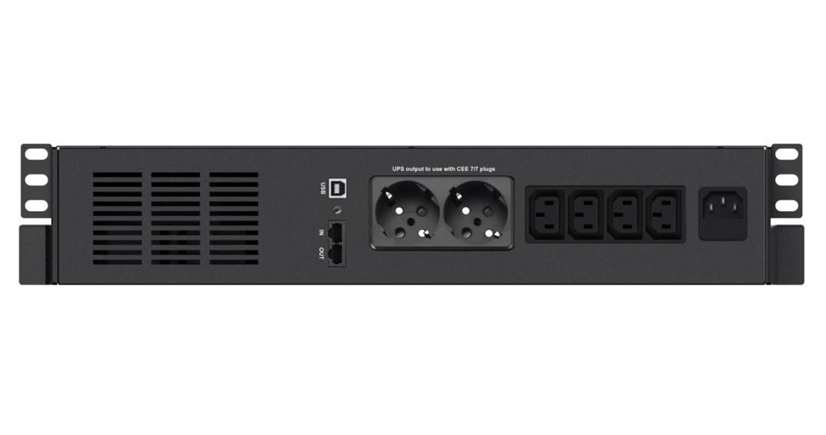 Chaque modèle est équipé à la fois de prises IEC et de prises de type FR/SCHUKO. Son port de communication USB permet le contrôle à distance de l'onduleur par le biais du logiciel Infopower (voir description au dos), qui gère également la fermeture automatique par l'onduleur des fichiers en cas d'absence secteur. X4 RM Plus protège également la ligne ADSL grâce aux connectuers RJ45.